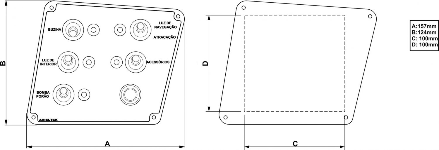 Painel de Comando em alumínio escovado com cinco chaves e led indicador de função, sendo uma chave para a função Buzina, uma chave para a função Luz de interior, uma chave para a função Bomba de Porão, uma chave para a função Luz de Navegação/Atracação e uma chave para a função Acessórios.